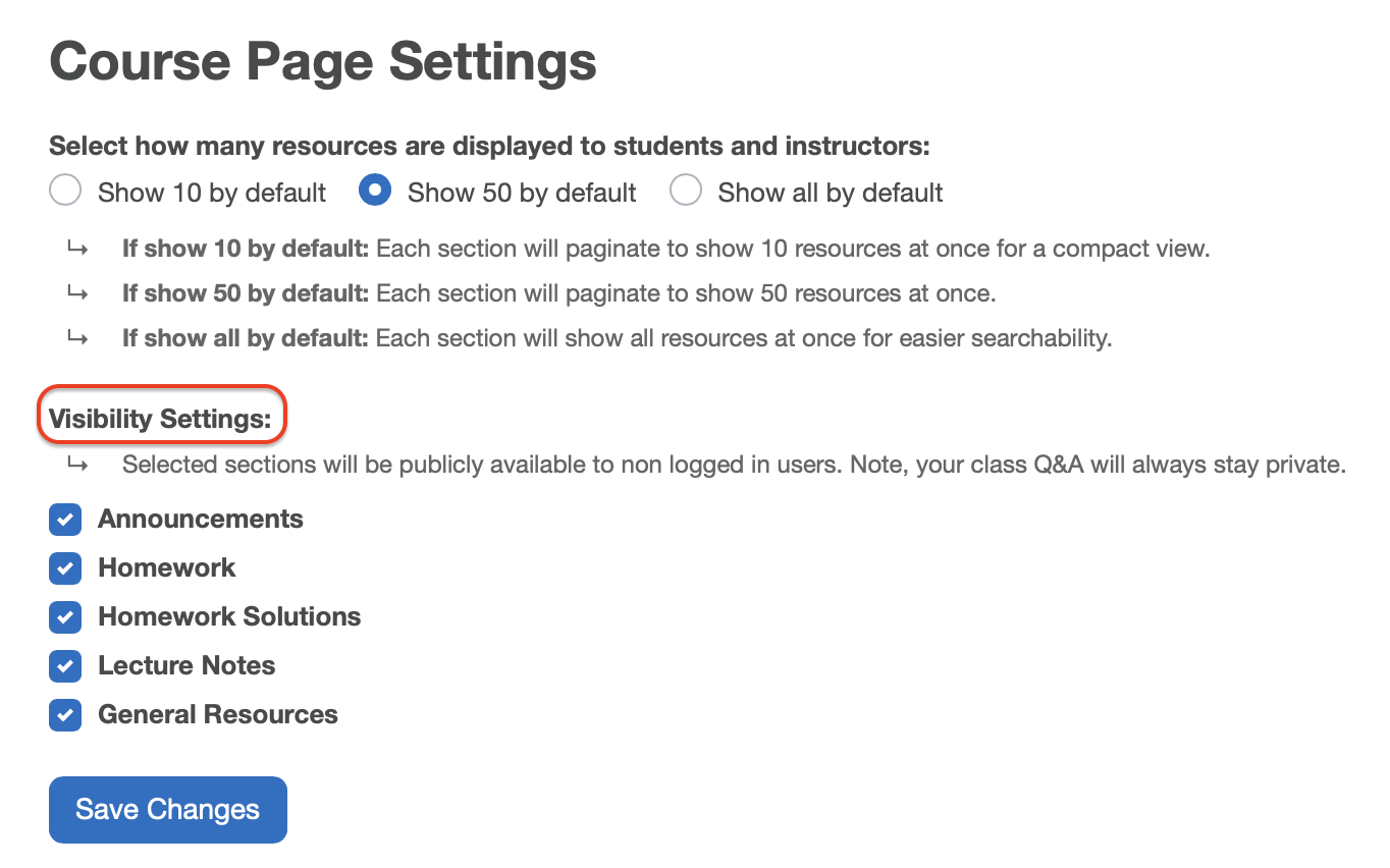 If you choose to keep all your Resource sections private, your Resources tab will not be visible to non logged-in users. Additionally, your Office Hour information on your Staff tab will always appear blank to non logged-in users.