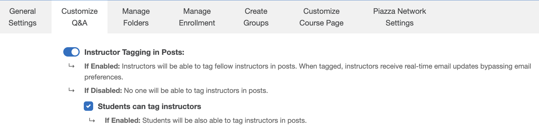 You have the option to allow students to tag instructors in posts. To do this, please click the Manage Class tab at the top of the page, and then click Customize Q&A. Then, under Instructor Tagging in Posts, select Students can tag instructors and click Save Changes.